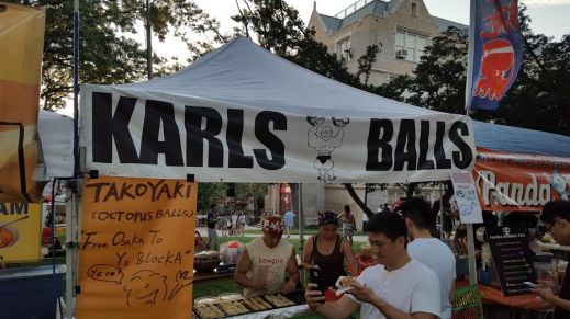 The food offerings were impressive and things are usually $5 or less. I had some excellent classic mac and cheese as well as fried mac and cheese from House of Mac, ate a tasty scallion pancake from Seoul Pancake, a seafood and pasta mix that had an Asian name I can’t remember from Teinei Ya and an amazing banana-flavored homemade pastry from Jai NYC Eats. The food booth that caught my attention the easiest was Karl’s Balls. Karl’s balls are delicious octopus balls. Meticulously tended to by the chef, the balls lived up to the hype. I can’t wait to have Karl’s Balls in my mouth again.