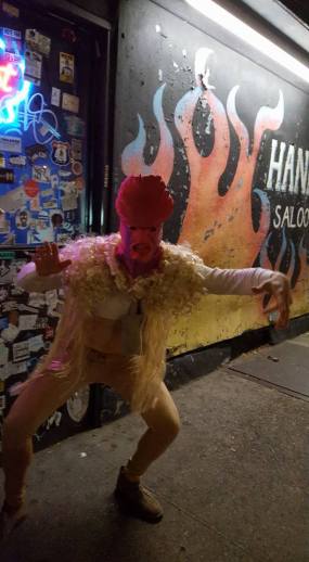 He said he initially had some kind of Donald Trump costume in mind, thus his plentiful supply of artificial blond hair and emphasis on a large mouth. But he decided to do something completely unique instead. I ask him to pose for a photo outside of Hank’s and he obliges, crouching down and doing a strange dance like you’d expect a giant tongue-man to do.