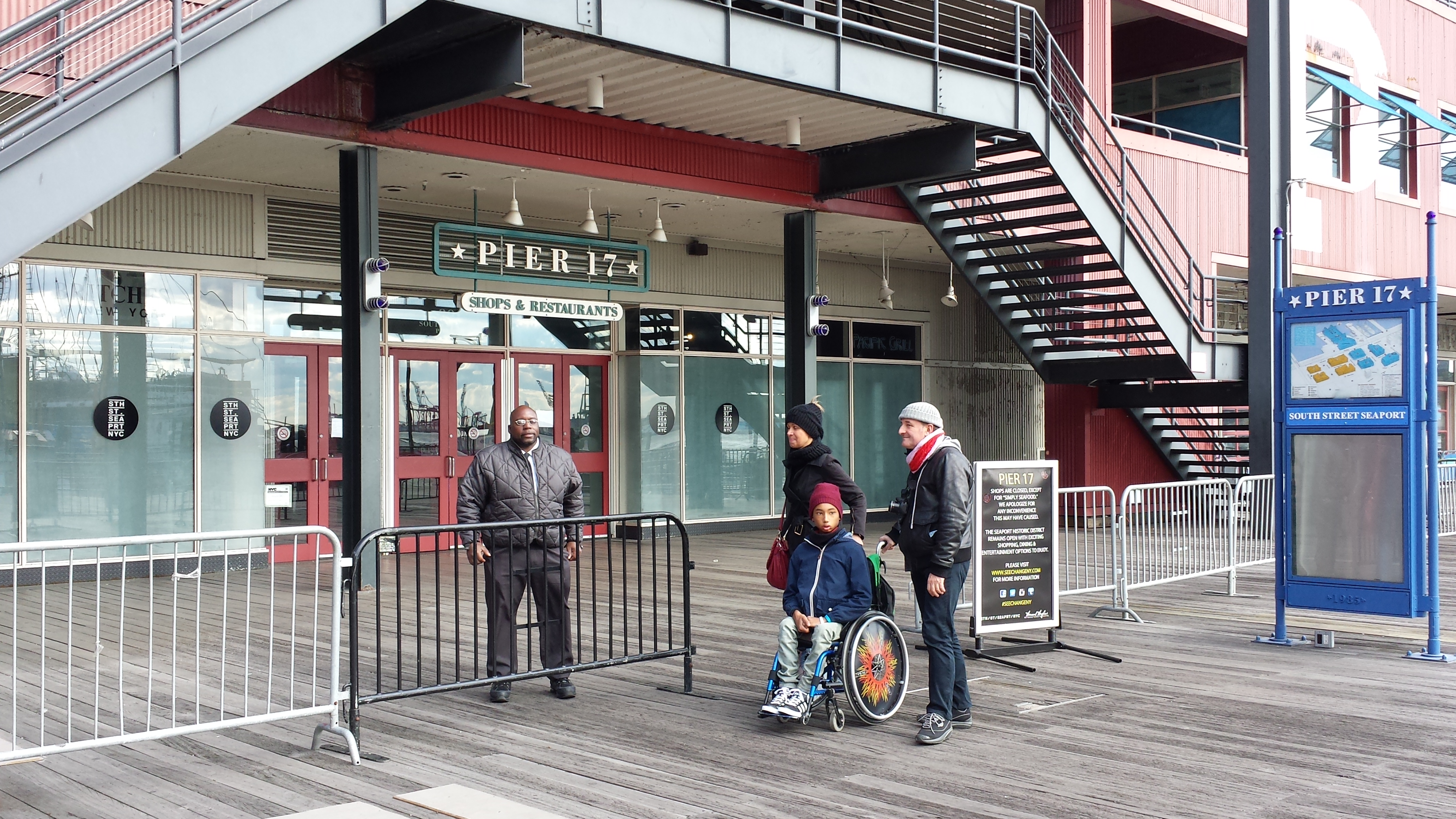 As I approached the Pier 17 mall, I found it surrounded by barricades with the only entrance guarded by a security guard turning people away. He admits that the restaurant is open, but calls it a “café” when it clearly is not.
